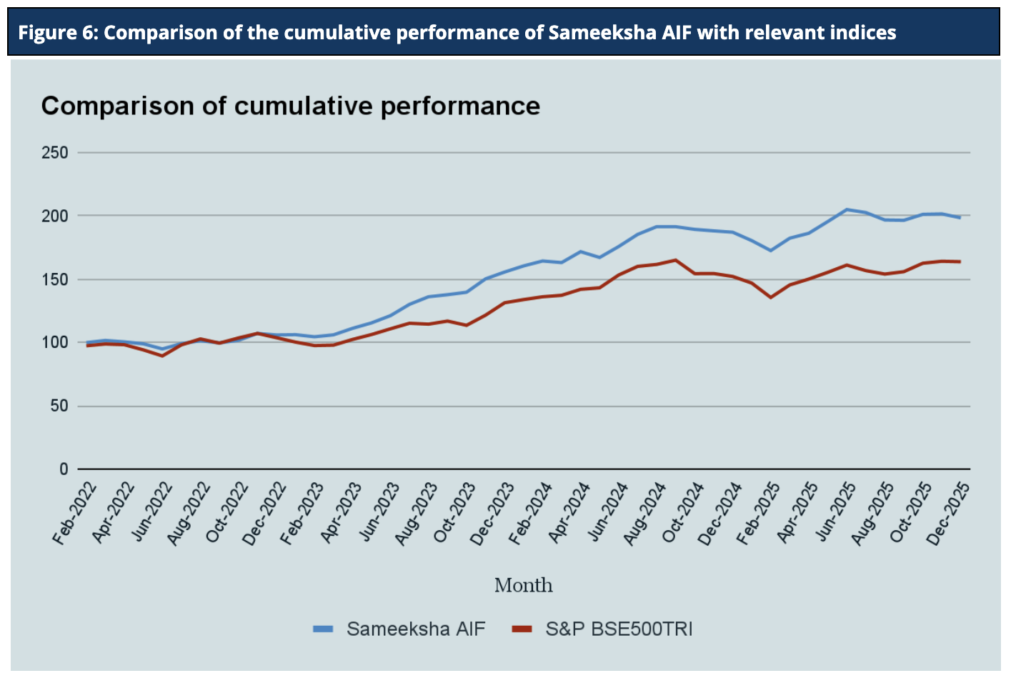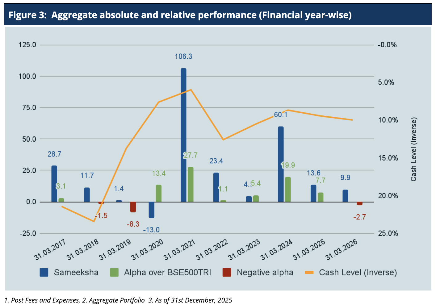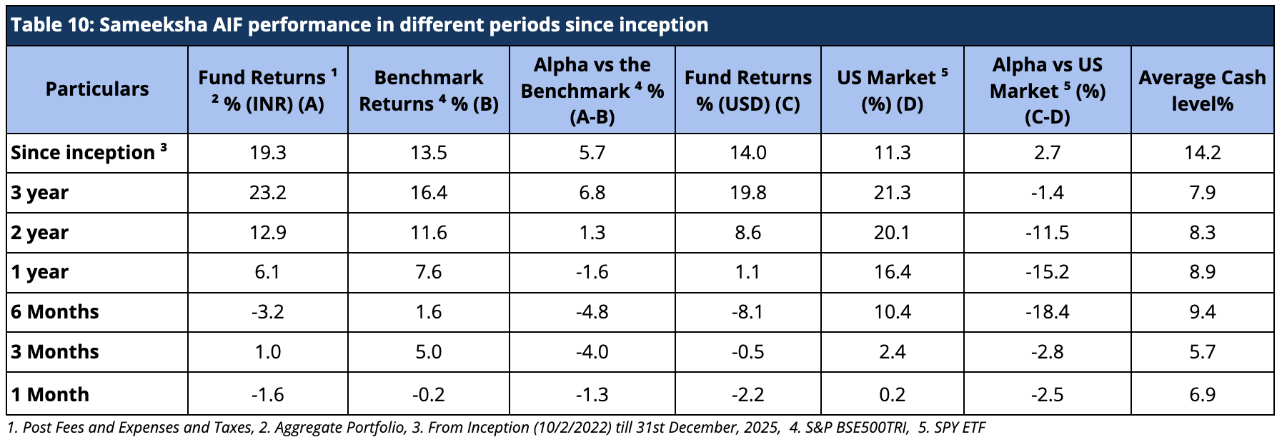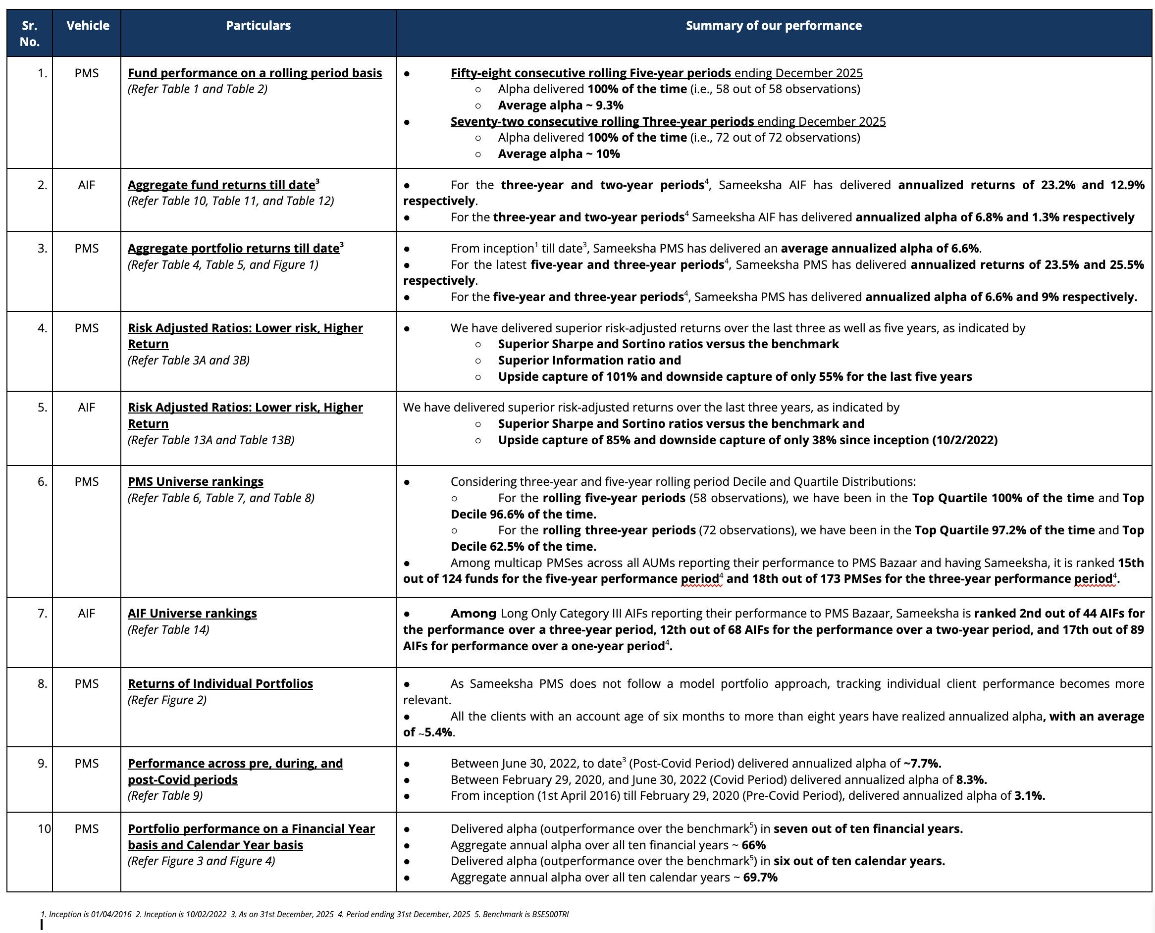 For FY26, Sameeksha AIF has underperformed the benchmark BSE 500 TRI by generating 8.8% returns against the benchmark BSE500TRI returns of 12.6%. Looking at our performance over the financial years (Table 11), we have outperformed our benchmark in FY 2023, FY 2024, and FY 2025.