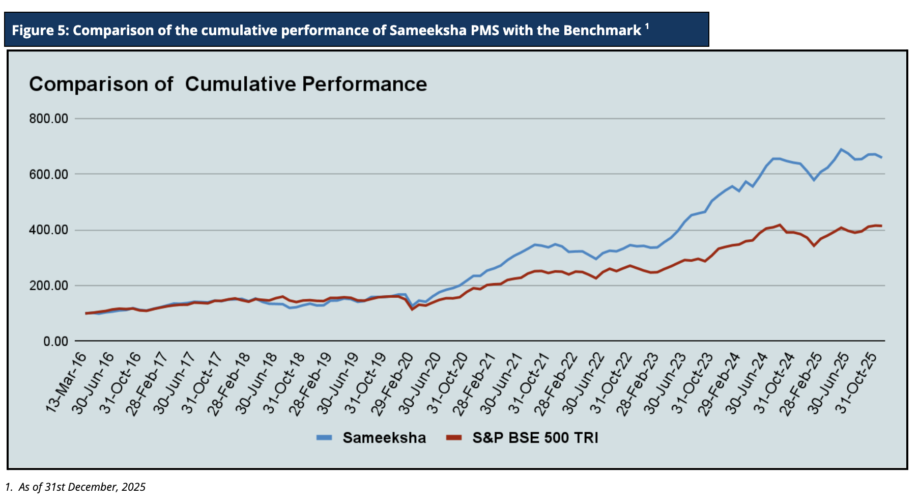 Sameeksha PMS’s outperformance over its benchmark has continued to widen positively over the years. An investment of Rs. 100 with us since inception (April 2016) would have grown to Rs. 659.6, far outpacing what one would have earned by investing in a fund that achieved benchmark returns (Figure 5).