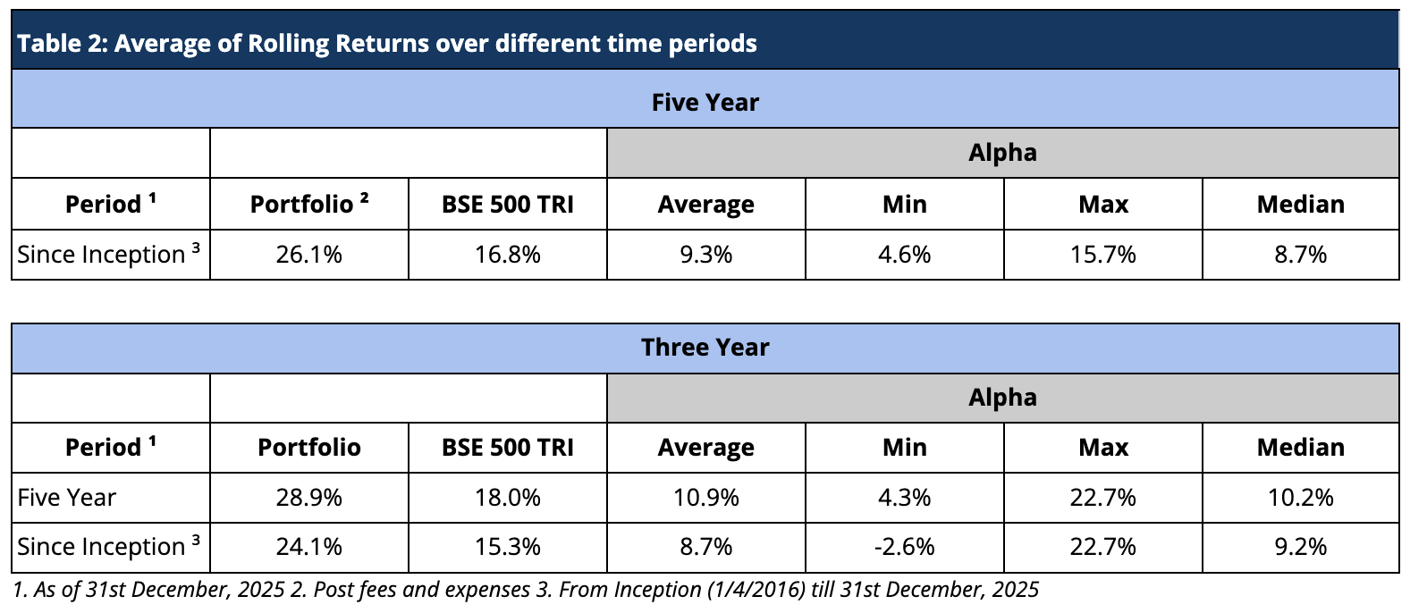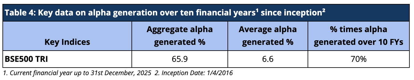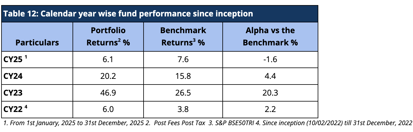 For the Calendar year 2025, we have underperformed the benchmark BSE 500 TRI by -1.6%. Despite being a new fund, we were still able to produce alpha for calendar years 2022, 2023, and 2024 and outperformed the benchmark BSE500 TRI by 2.2%, 20.3% and 4.4% respectively (Table 12).