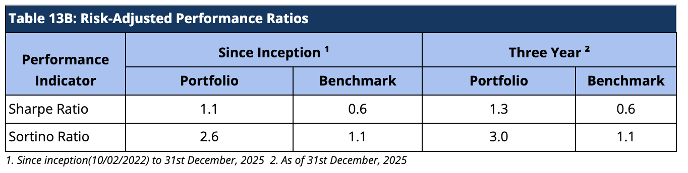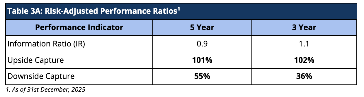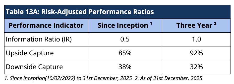 When compared on a risk-adjusted basis, our AIF has shown an even stronger performance. The Information Ratio (IR) measures the excess return of a portfolio over a benchmark per unit of active risk. A higher Information Ratio (IR) suggests better risk-adjusted performance.