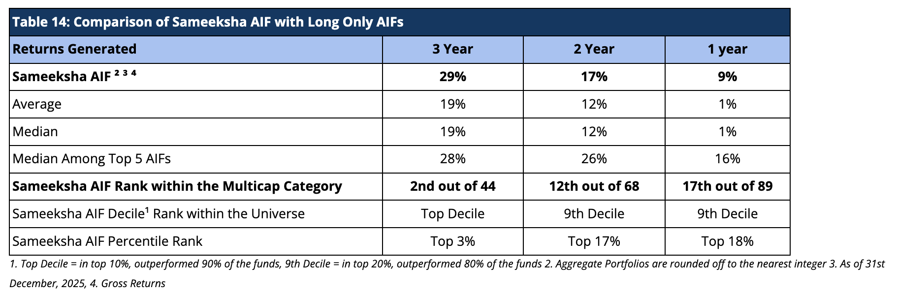 We present our rankings among Long Only Category III AIFs. For the period ending 31st December, 2025, we are ranked 2nd out of 44 AIFs for the three-year period, 12th out of 68 AIFs for the two-year period, and 17th out of 89 AIFs for the one-year period (Table 14). Sameeksha has been Top Decile consistently in the last three years. Because there is a lot of divergence in the way funds report their returns (post-exp & tax; post-exp, pre-tax; gross returns, and post-exp & tax pre-perf. fees &), we are doing a comparison on gross return basis to cover the entire applicable universe of funds.