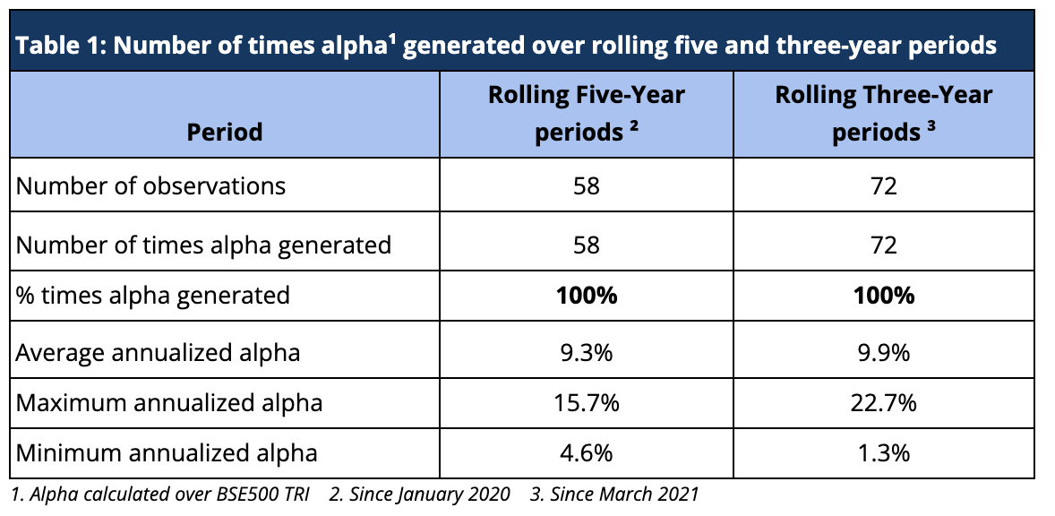 Rolling returns are a more useful indicator of consistency in performance versus single-period returns. For the rolling five-year periods applicable from March 2021 till date, Sameeksha PMS has delivered aggregate annualized alpha 100% of the time (58 out of 58 observations), ranging from ~5% to ~16%. For the rolling three-year periods applicable from January 2020 till date, Sameeksha PMS has delivered aggregate annualized alpha 100% of the time (72 out of 72 observations), ranging from ~1% to ~23% (Table 1). For both rolling five and three-year periods covered in Table 1, alpha has averaged around 9.3% and 10% respectively.