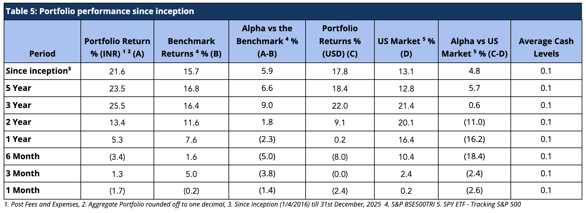 It is important to note that we have maintained relatively higher levels of cash (12.6% on average over the entire period since inception) from time to time throughout the management of the portfolio. Notwithstanding the same, from inception, over five years and three years respectively, we have generated returns of 21.6%, 23.5% and 25.5% in INR terms and 17.8%, 18.4%, and 22% in USD terms, thus generating substantial alpha over the Indian benchmark BSE500 TRI. Also, we have delivered strong returns relative to benchmark across various key time periods (Figure 1 and Table 5).