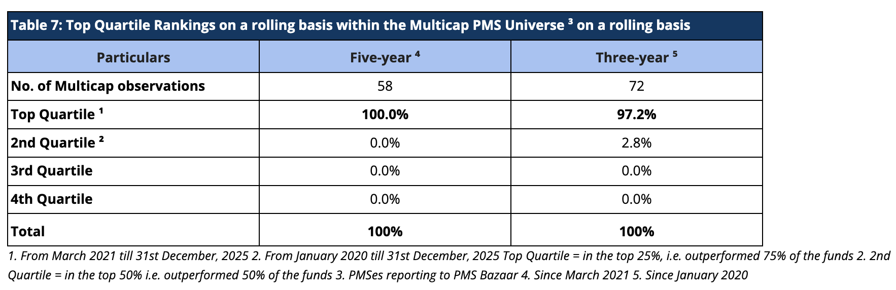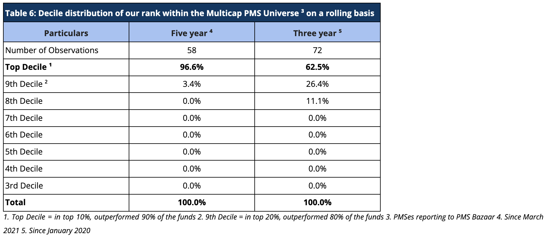 For rolling three-year periods applicable since January 2020, we have been ranked among the multicap universe in the Top Decile 62.5% of the time (45 out of 72 observations) and in the Top Quartile 97.2% of the time (70 out of 72 observations). For rolling five-year periods applicable to our entire operating history, we have been ranked among the multicap universe in the Top Quartile 100% (58 out of 58 observations) and Top Decile 96.6% of the time (56 out of 58 observations) (Tables 6 and 7).