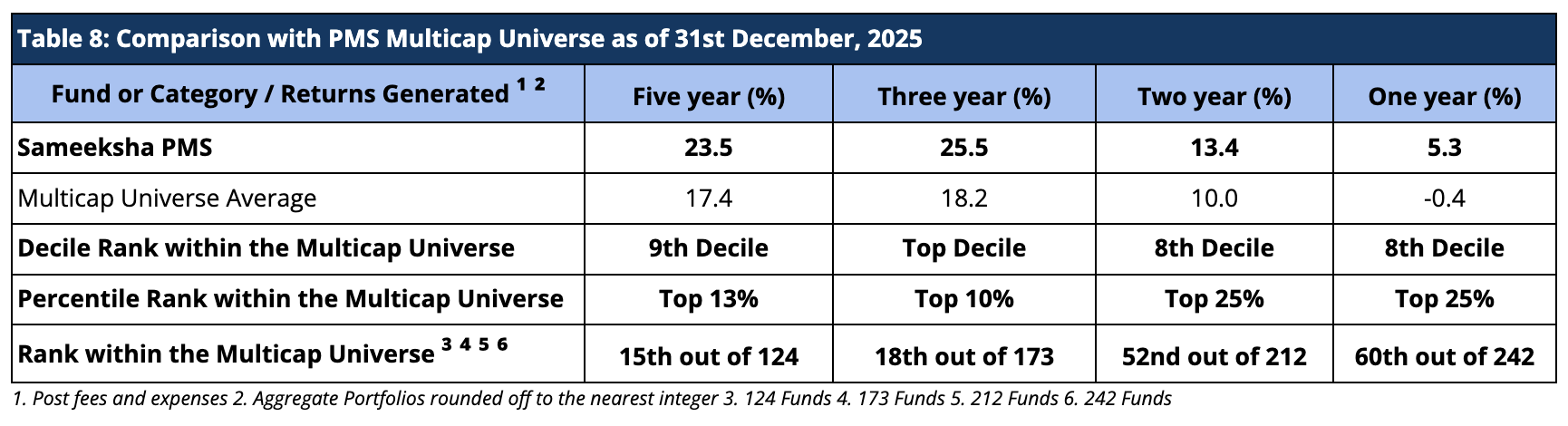 We continue to maintain our top rankings both within the multicap PMS universe as well as the entire PMS universe for key periods of three and five years. The multicap PMS universe rankings are more relevant to us since we follow the multicap strategy.