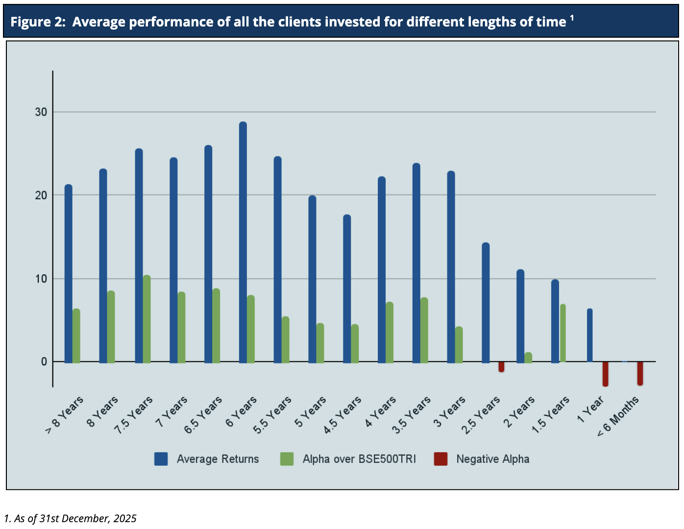 Because we don’t follow a model portfolio strategy, the performance of individual clients is far more important than overall portfolio aggregate returns (Figure 2). For investors who have been with us for five years or more, Sameeksha PMS has returned a very substantial alpha with an average annualized alpha of approx. 6.3% for the five years ending 31st December, 2025. Similarly, for investors who have been with us for three years or more, Sameeksha PMS has returned substantial alpha with an average annualized alpha of approx. 8.8% for the three years ending 31st December, 2025. The Figure below shows the average annualized returns and alpha over different periods of time of all the clients as on 31st December, 2025.
