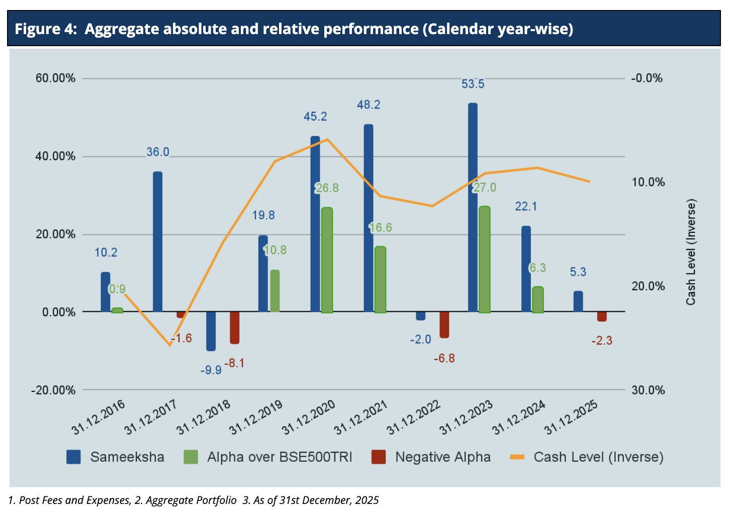 We concluded the Calendar Year 2025, with underperformance of roughly 2.3% lower than the BSE 500 TRI benchmark. Looking at our performance over calendar years (Figure 4), we have outperformed the benchmark in six out of ten calendar years, and the sum of outperformance of 88.4% in six years far exceeds the sum of underperformance of 18.8% in the remaining four years.