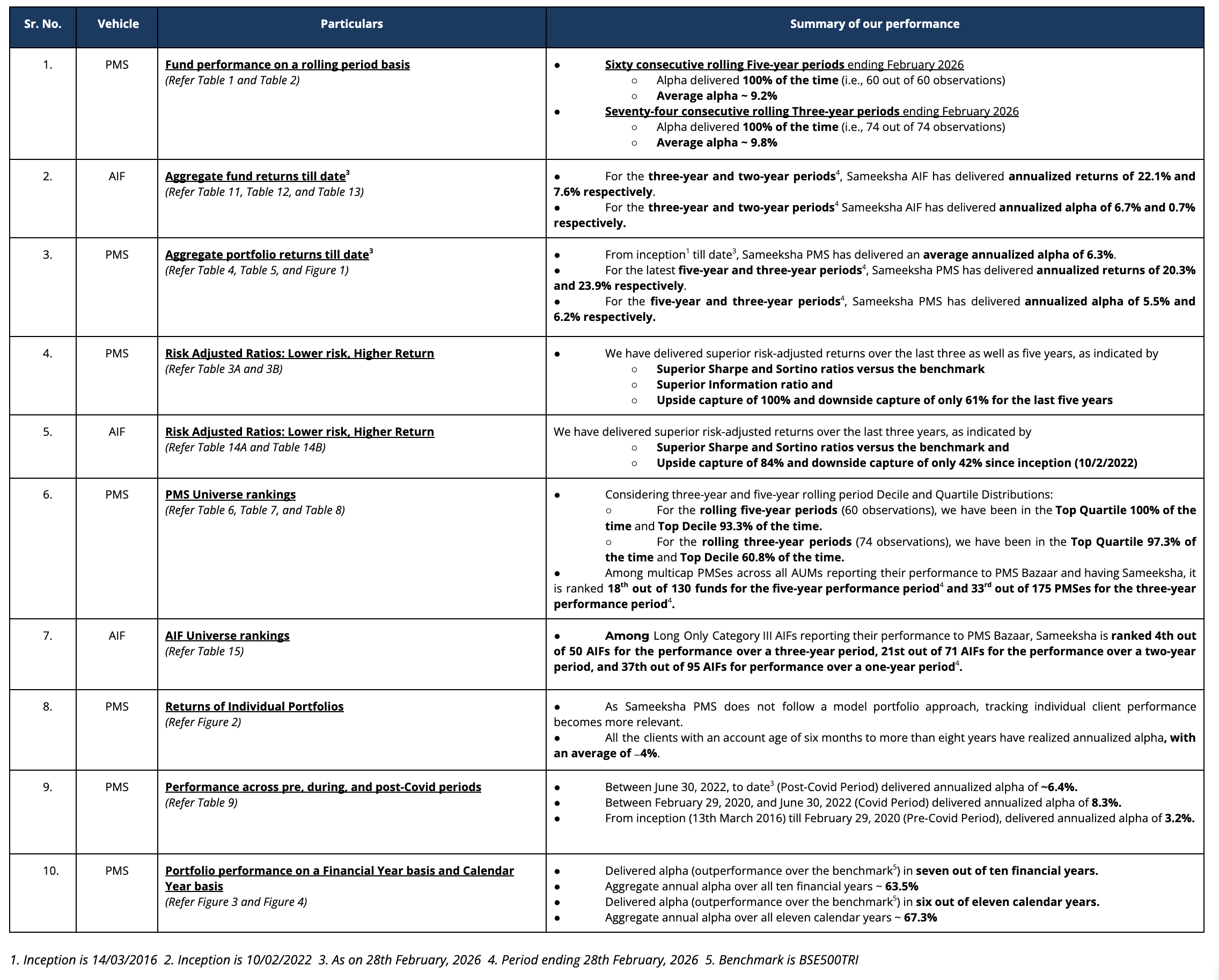 For FY26, Sameeksha AIF has underperformed the benchmark BSE 500 TRI by generating 4.4% returns against the benchmark BSE 500 TRI returns of 9.3%. Looking at our performance over the financial years (Table 12), we have outperformed our benchmark in FY 2023, FY 2024, and FY 2025.