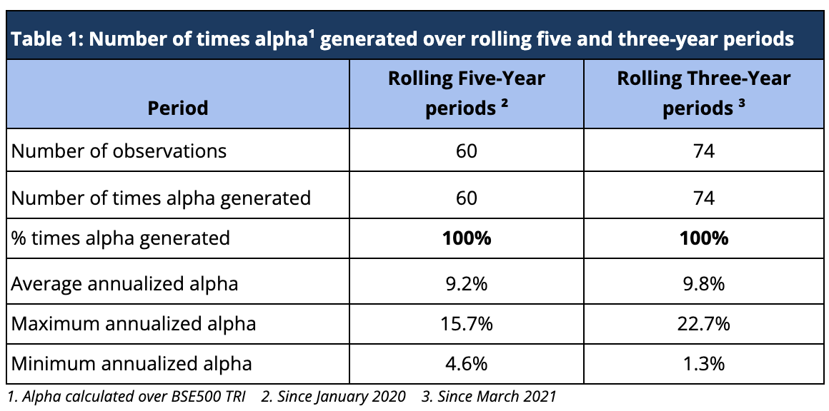 Rolling returns are a more useful indicator of consistency in performance versus single-period returns. For the rolling five-year periods applicable from March 2021 till date, Sameeksha PMS has delivered aggregate annualized alpha 100% of the time (60 out of 60 observations), ranging from ~5% to ~16%. For the rolling three-year periods applicable from January 2020 till date, Sameeksha PMS has delivered aggregate annualized alpha 100% of the time (74 out of 74 observations), ranging from ~1% to ~23% (Table 1). For both rolling five and three-year periods covered in Table 1, alpha has averaged around 9.2% and 9.8% respectively.