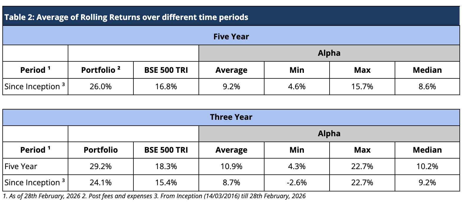 The results reveal a strong and persistent pattern of outperformance. Across all measured periods, average three-year or five-year rolling returns have consistently outpaced the benchmark. What stands out in particular is the stability of alpha across different lookback periods. This consistency suggests that the portfolio’s success is not driven by isolated bets or favorable market timing, but rather by a disciplined and repeatable process. The rolling return framework helps illustrate that this performance is not a result of temporary market positioning but instead reflects a reliable, long-term approach to investing.