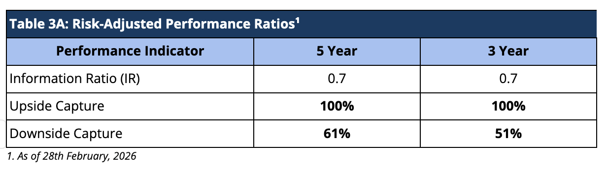 When compared on a risk-adjusted basis, our AIF has shown an even stronger performance. The Information Ratio (IR) measures the excess return of a portfolio over a benchmark per unit of active risk. A higher Information Ratio (IR) suggests better risk-adjusted performance.