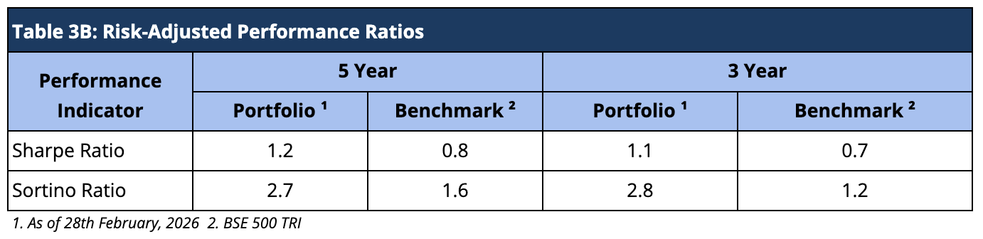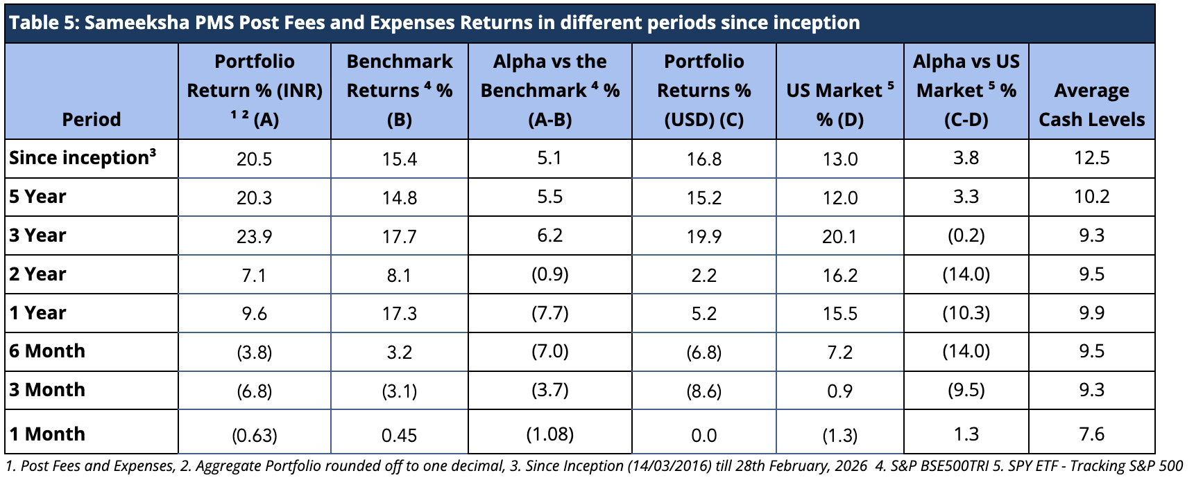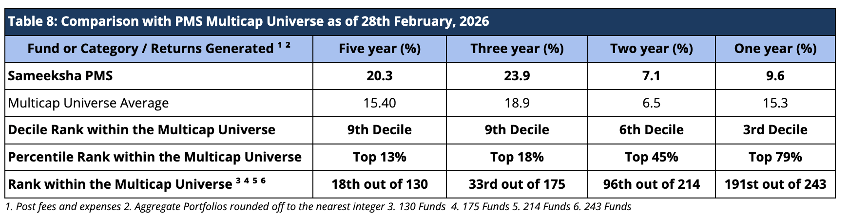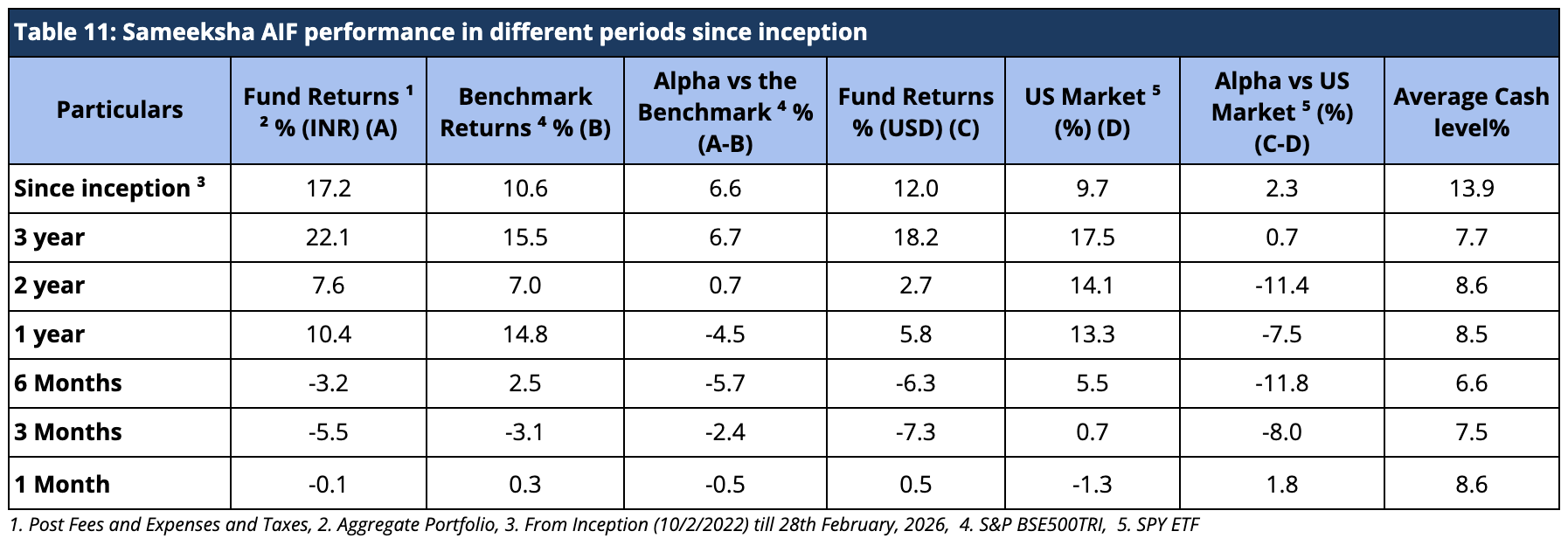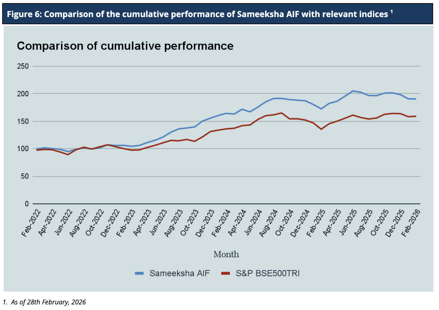 After rising 535% on absolute terms and 51% annualized over a period from March 25, 2020 to September 23, 2024, Nifty Small Cap 250 TRI index has struggled, falling 11% since then till 28th February 2026. Given the weak performance of the Indian market over this period of almost eighteen months, it is worth looking back at our performance during this period of extended slump. During the said period, Nifty Small Cap 250 TRI is down 9.5%, BSE 500 TRI is down 3.3% and against that our PMS is down 2% on a post fees and expenses basis and our AIF is down 1.2% on post fees, expenses and tax basis. Considering consistently high (~60%) exposure to small cap and below space in our strategy, performance comparison with both the broad BSE 500 TRI and Nifty Small Cap 250 TRI is appropriate.