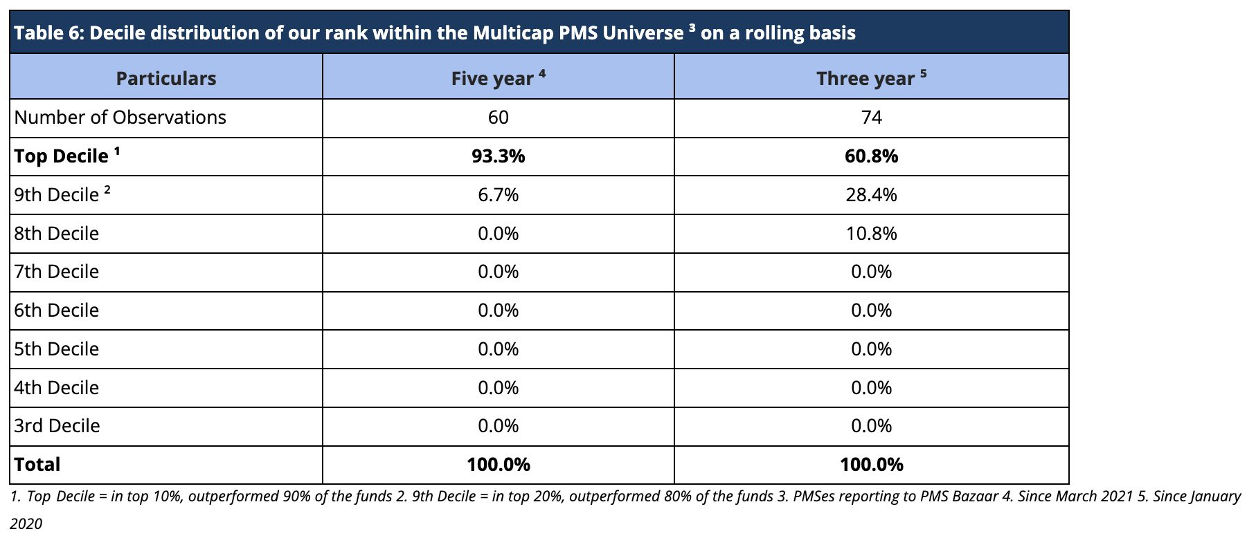 We present our rankings among the multicap PMSes across all AUM sizes. Within this universe, we are 18th out of 130 PMSes for the five year period and 33rd out of 175 PMSes for three-year period, highlighting our superior performance over the long term periods (Table 8). Among the multicap universe across all AUM sizes, we are consistently ranked in the Top Decile for the five-year period for 56 out of 60 observations, reflecting well on the consistency of our performance.