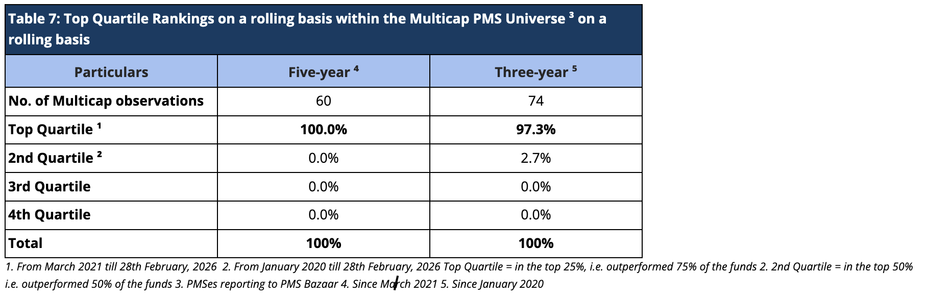 *Period ending 28th February, 2026, ** Three-year period for PMS and AIF, also five year period for PMS, *** Rolling five-year returns of all the Multicap PMSes reporting to PMS Bazaar, **** For rolling five year periods from inception till date, ***** Five-year Period