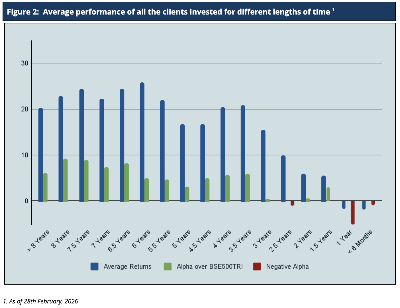 Because we don’t follow a model portfolio strategy, the performance of individual clients is far more important than overall portfolio aggregate returns (Figure 2). For investors who have been with us for five years or more, Sameeksha PMS has returned an alpha with an average annualized alpha of approx. 4% for the five years ending 28th February, 2026. Similarly, for investors who have been with us for three years or more, Sameeksha PMS has returned alpha with an average annualized alpha of approx. 4.8% for the three years ending 28th February, 2026. The Figure below shows the average annualized returns and alpha over different periods of time of all the clients as on 28th February, 2026.