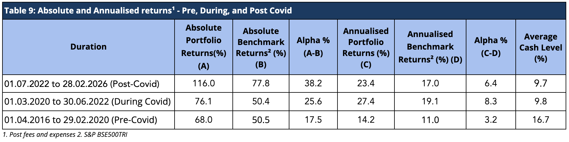 The COVID-19 pandemic induced significant volatility in the equity markets. Hence, it is useful to look at the performance across three time slices: Pre-COVID, During Covid, and Post-Covid. Sameeksha PMS has outperformed the benchmark across all three time periods with meaningful alpha (Table 9). This consistency of performance may be an important factor in comparing us with the other funds.