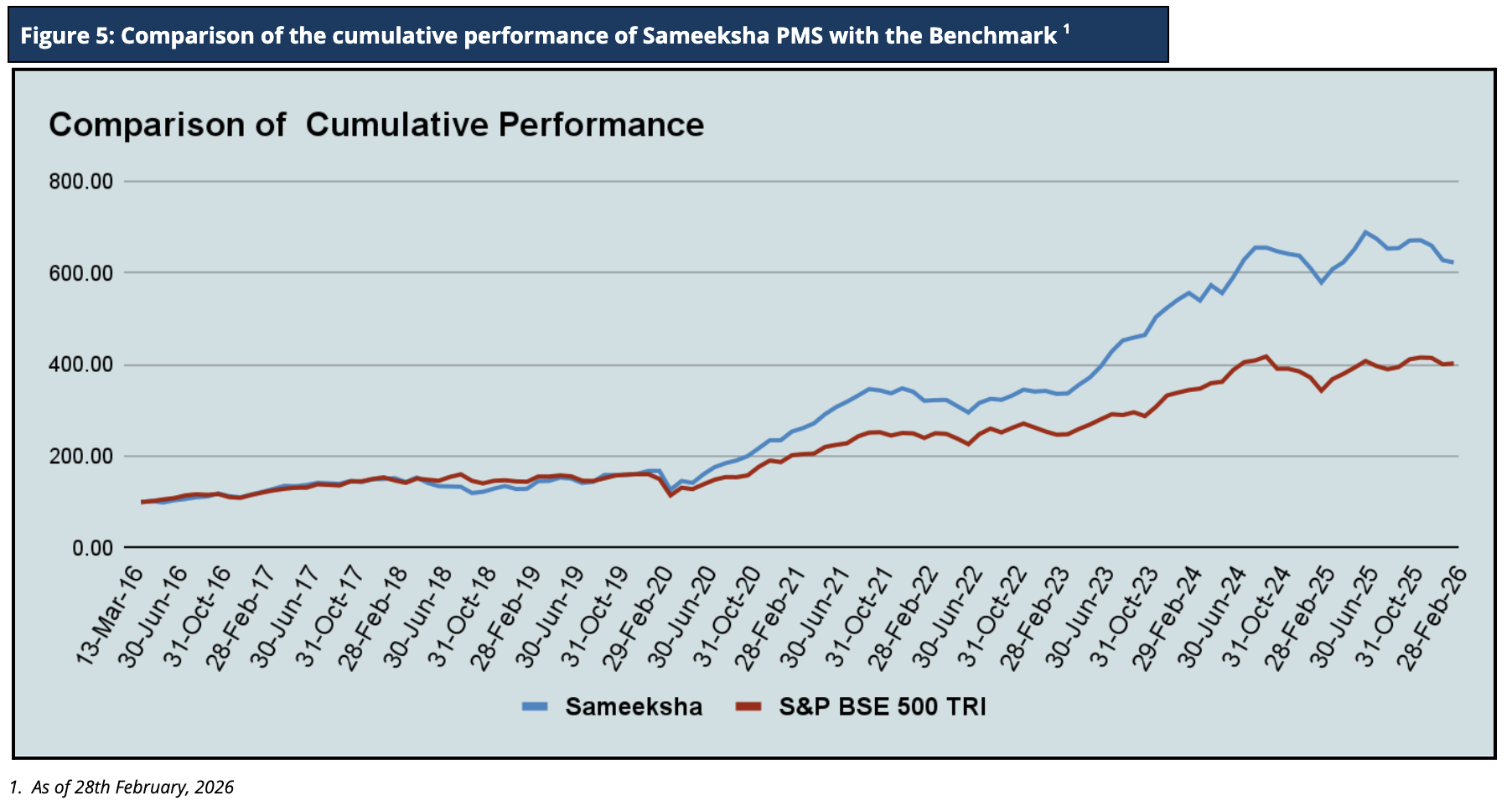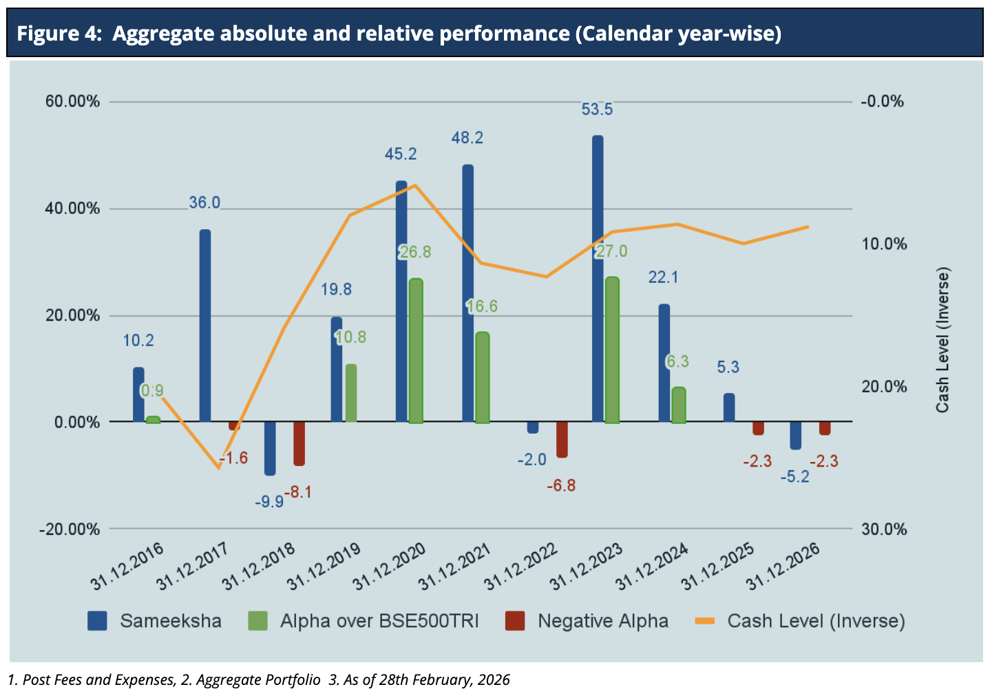 For February, Sameeksha PMS has underperformed the benchmark BSE 500 TRI by 1.1%. For Financial Year 2025-26, we have underperformed BSE500 TRI by 5.1%. Looking at our performance over the financial years (Figure 3), we have outperformed our benchmark in seven out of ten financial years. Key however, is that the sum of outperformance of 78.4% in those seven years far exceeds the sum of underperformance of 14.9% in the remaining three years.