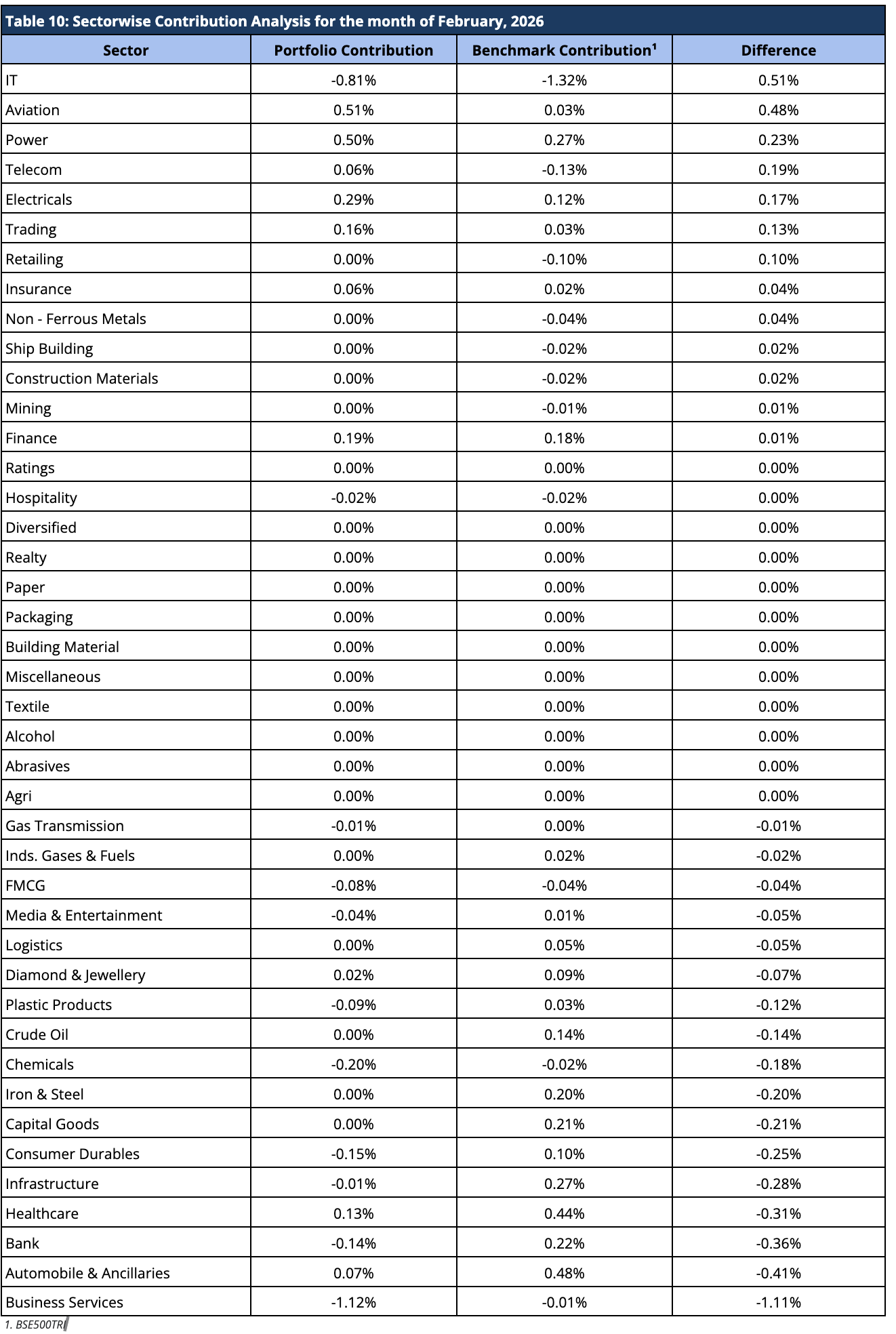 The PMS portfolio underperformed the benchmark in February 2026. The portfolio performed well in sectors like IT, Aviation, Power and Telecom with additional support from Electricals, Trading and Retailing relative to the benchmark. However, sectors such as Business Services, Automobile & Ancillaries, Bank, Healthcare, Infrastructure and Consumer Durables underperformed significantly relative to the benchmark. Overall, while selective sector exposures added value, broad-based weakness across several key segments led to portfolio underperformance for the month.