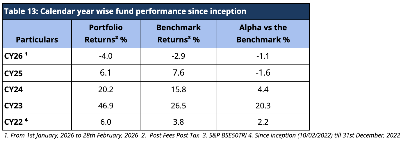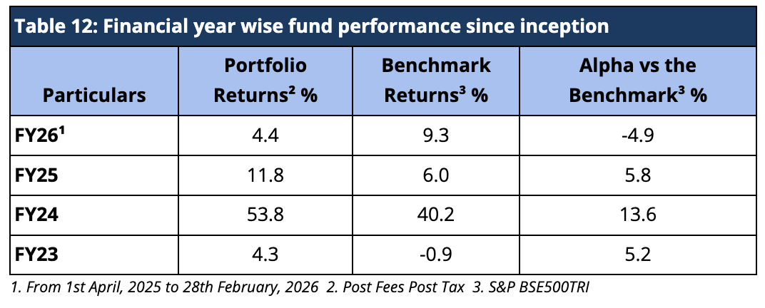 For the Calendar year 2026, we have underperformed the benchmark BSE 500 TRI by 1.1%. Despite being a new fund, we were still able to produce alpha for calendar years 2022, 2023, and 2024 and outperformed the benchmark BSE500 TRI by 2.2%, 20.3% and 4.4% respectively (Table 13).