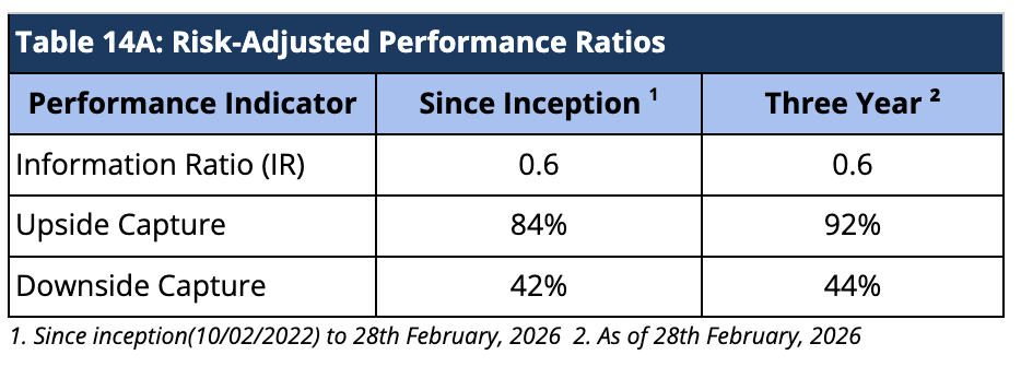 Moreover, Upside Capture measures how well a fund performs as compared to a benchmark when the benchmark has positive returns. A higher upside capture ratio (> 100%) indicates that the fund captures more of the benchmark’s positive movements. Whereas, Downside Capture measures how well a fund performs compared to a benchmark when the benchmark has negative returns. A lower downside capture ratio (< 100%) indicates that the fund preserves capital better during market downturns (Table 14A).
