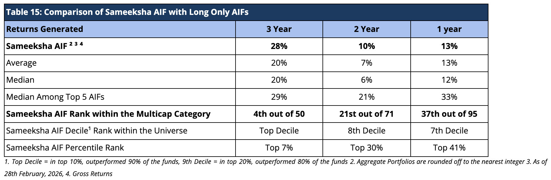 We present our rankings among Long Only Category III AIFs. For the period ending 28th February, 2026, we are ranked 4th out of 50 AIFs for the three-year period, 21st out of 71 AIFs for the two-year period, and 37th out of 95 AIFs for the one-year period (Table 15). Sameeksha has been Top Decile consistently in the last three years. Because there is a lot of divergence in the way funds report their returns (post-exp & tax; post-exp, pre-tax; gross returns, and post-exp & tax pre-perf. fees &), we are doing a comparison on gross return basis to cover the entire applicable universe of funds.