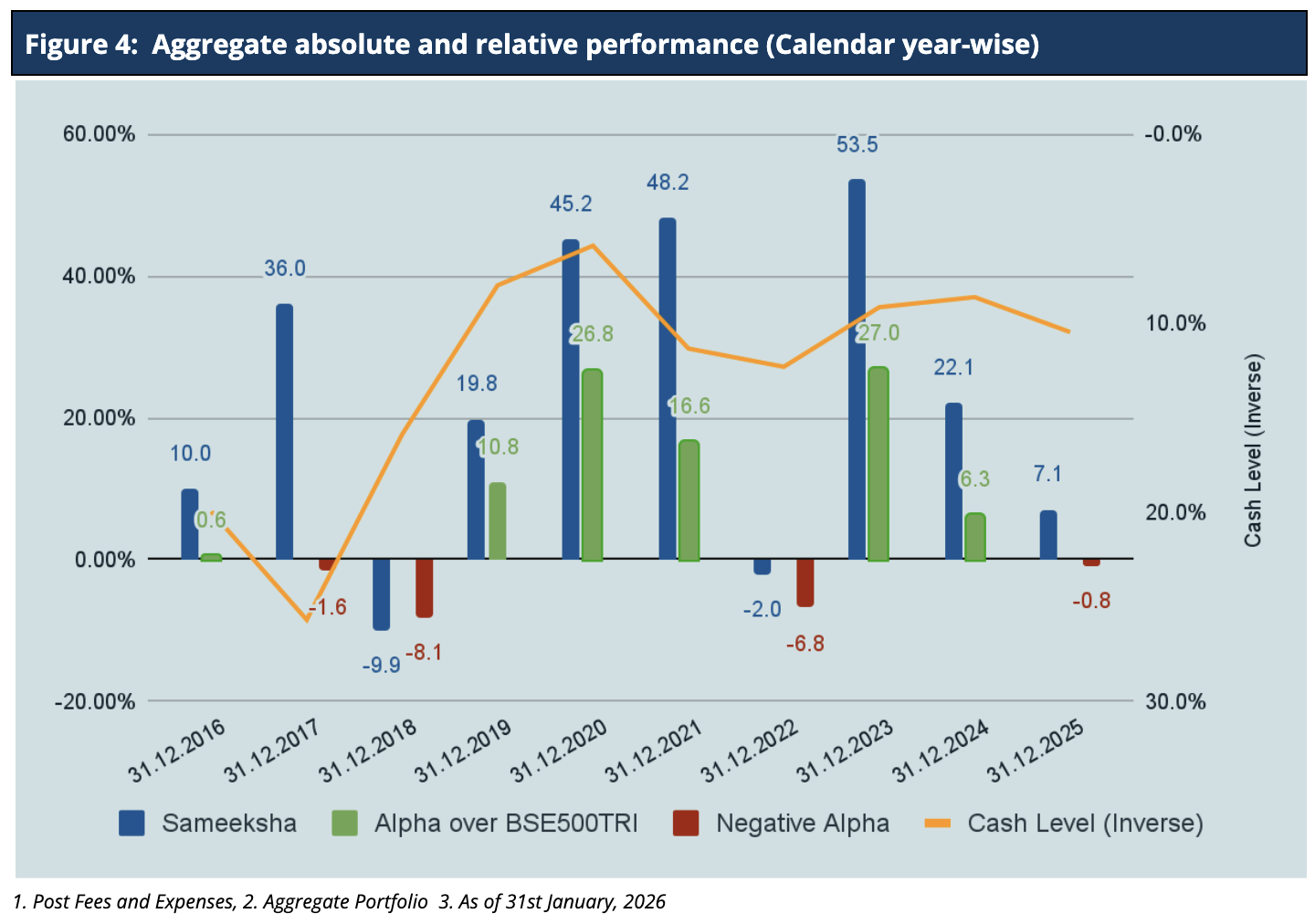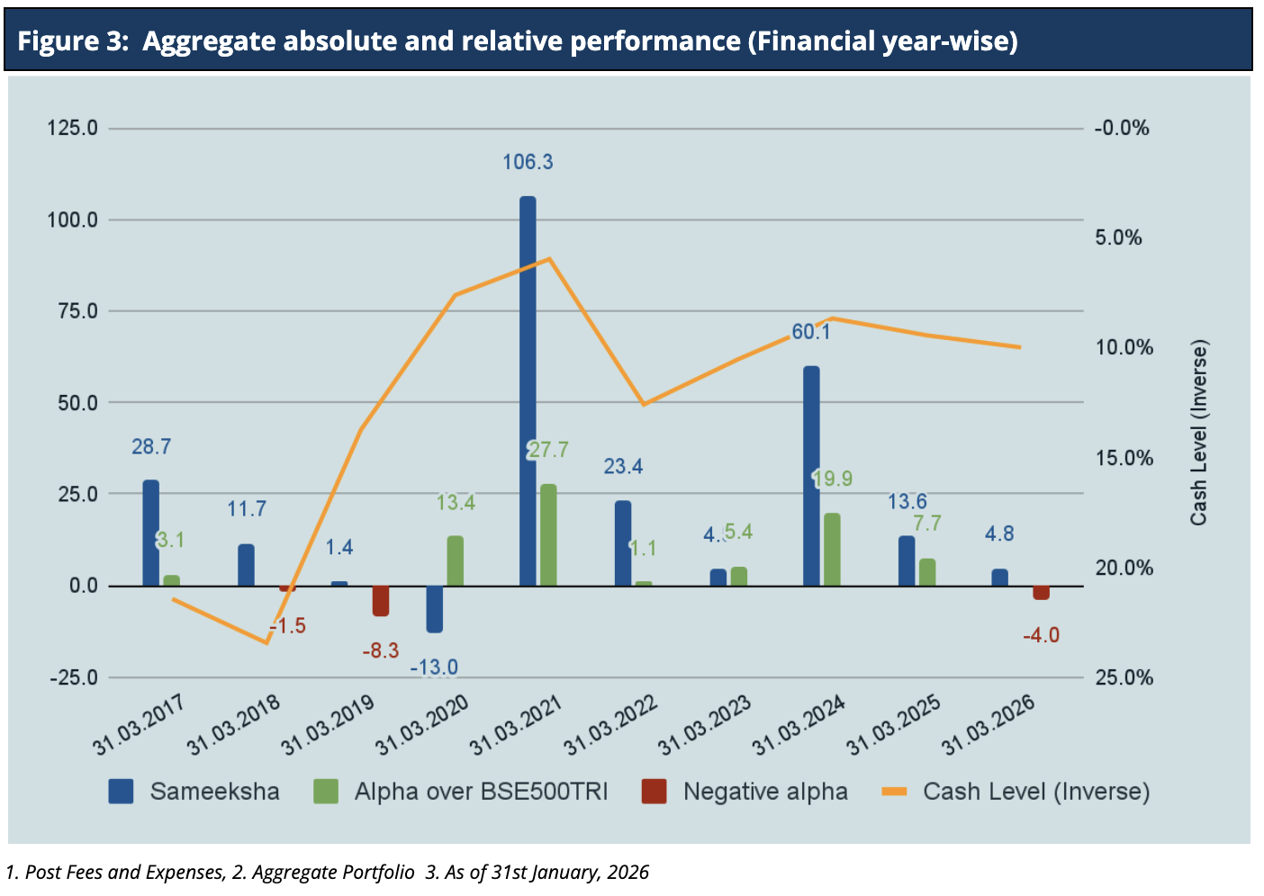 For January, Sameeksha PMS has underperformed the benchmark BSE 500 TRI by 1.3%. For Financial Year 2025-26, we have underperformed BSE500 TRI by 4%. Looking at our performance over the financial years (Figure 3), we have outperformed our benchmark in seven out of ten financial years. Key however, is that the sum of outperformance of 78.4% in those seven years far exceeds the sum of underperformance of 13.8% in the remaining three years.