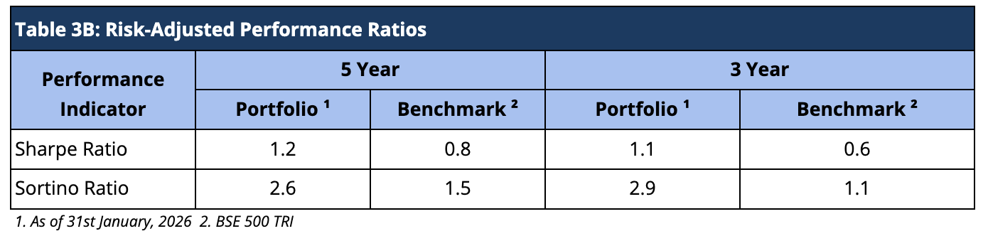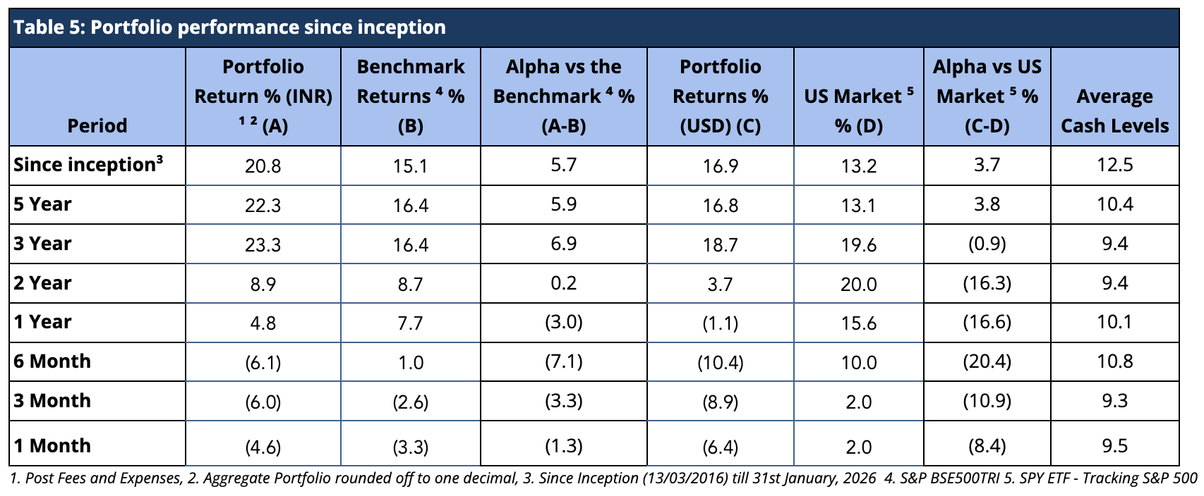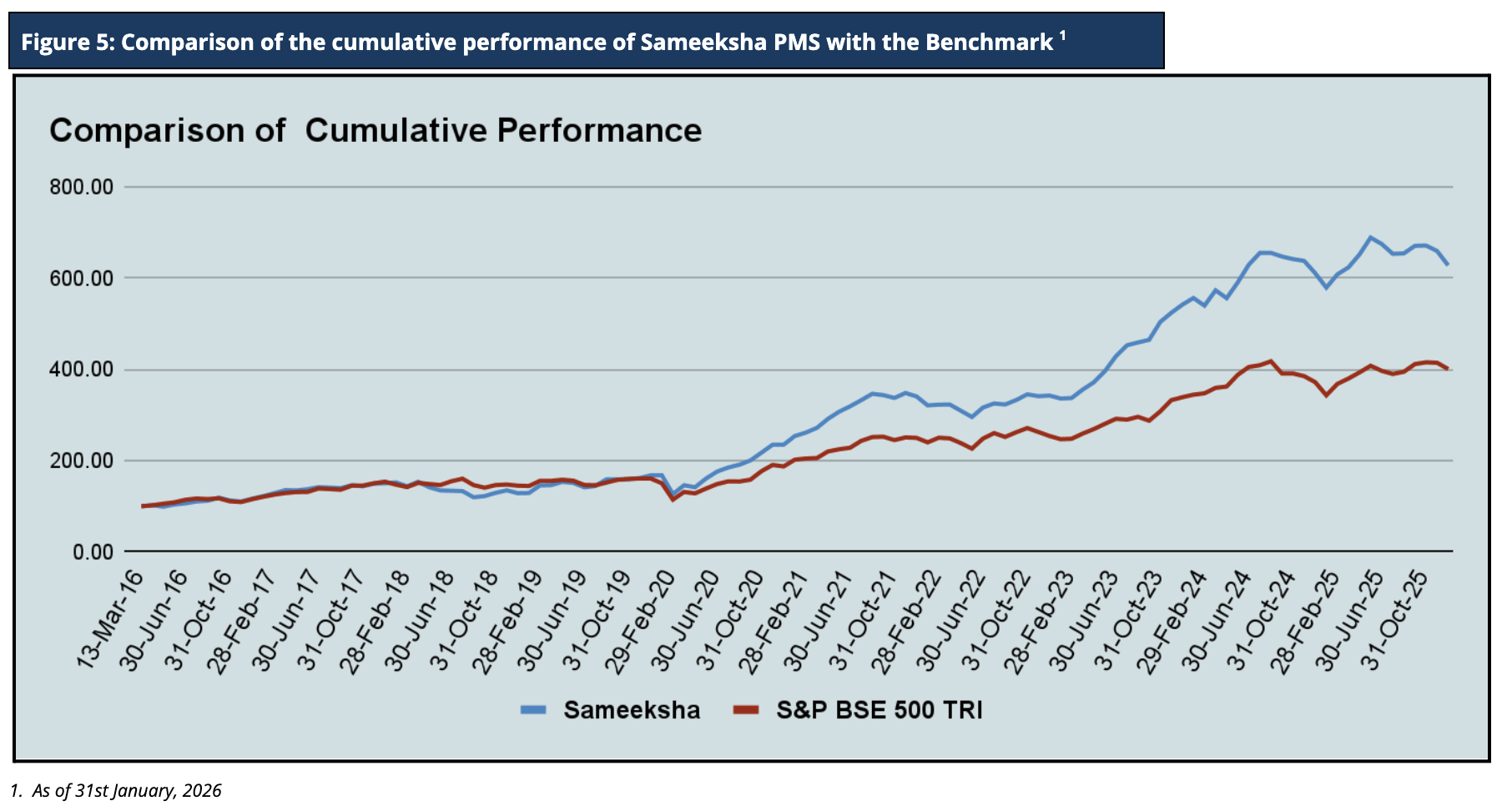After rising 535% on absolute terms and 51% annualized over a period from March 25, 2020 to September 23, 2024, Nifty Small Cap 250 TRI index has struggled, falling 11% since then till 31st Jan 2026. Given the weak performance of the Indian market over this period of almost eighteen months, it is worth looking back at our performance during this period of extended slump. During the said period, Nifty Small Cap 250 TRI is down 11%, BSE 500 TRI is down 6% and against that our PMS is down 3.8% on a post fees and expenses basis and our AIF is down 1.1% on post fees, expenses and tax basis. Considering consistently high (~60%) exposure to small cap and below space in our strategy, performance comparison with both the broad BSE 500 TRI and Nifty Small Cap 250 TRI is appropriate.