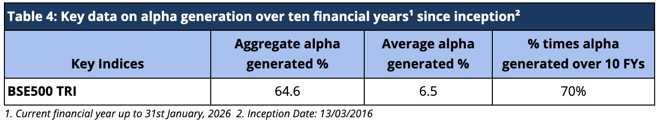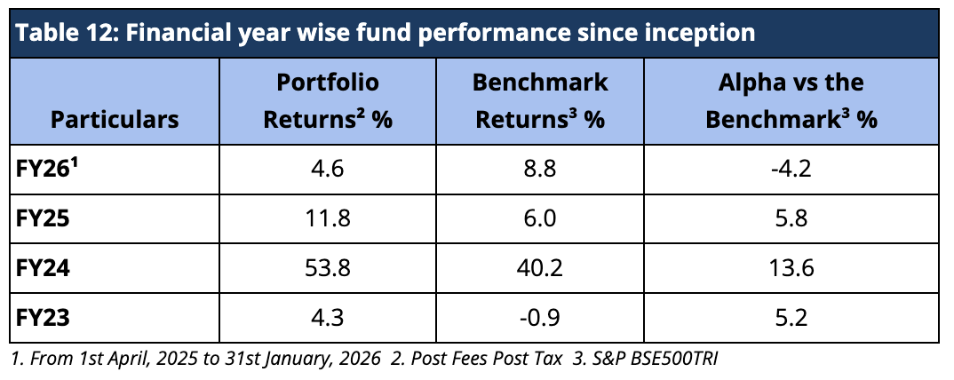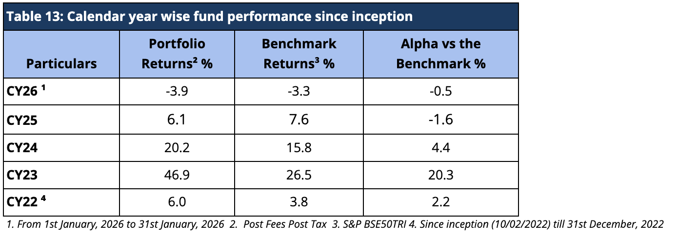 For the Calendar year 2026, we have underperformed the benchmark BSE 500 TRI by -0.5%. Despite being a new fund, we were still able to produce alpha for calendar years 2022, 2023, and 2024 and outperformed the benchmark BSE500 TRI by 2.2%, 20.3% and 4.4% respectively (Table 13).