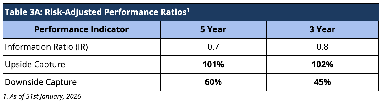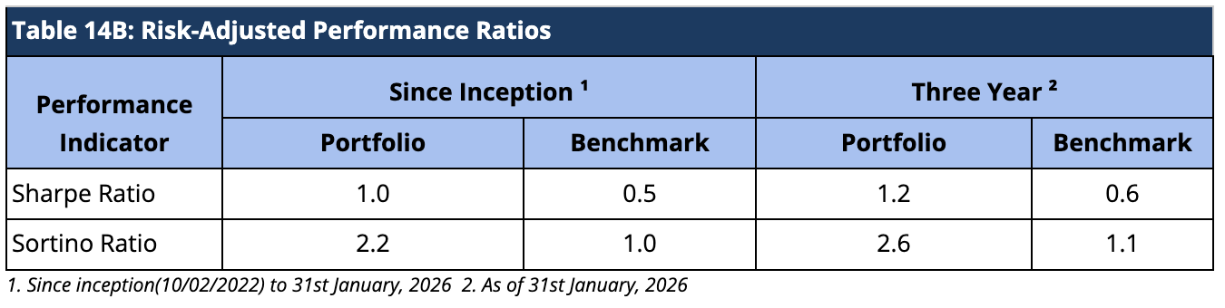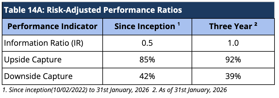 When compared on a risk-adjusted basis, our AIF has shown an even stronger performance. The Information Ratio (IR) measures the excess return of a portfolio over a benchmark per unit of active risk. A higher Information Ratio (IR) suggests better risk-adjusted performance.
