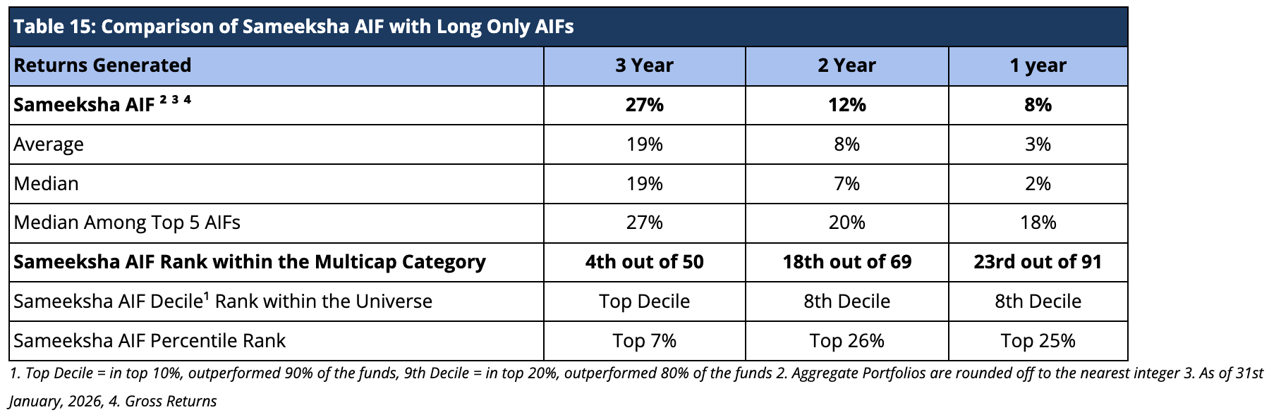 We present our rankings among Long Only Category III AIFs. For the period ending 31st January, 2026, we are ranked 4th out of 50 AIFs for the three-year period, 18th out of 69 AIFs for the two-year period, and 23rd out of 91 AIFs for the one-year period (Table 15). Sameeksha has been Top Decile consistently in the last three years. Because there is a lot of divergence in the way funds report their returns (post-exp & tax; post-exp, pre-tax; gross returns, and post-exp & tax pre-perf. fees &), we are doing a comparison on gross return basis to cover the entire applicable universe of funds.