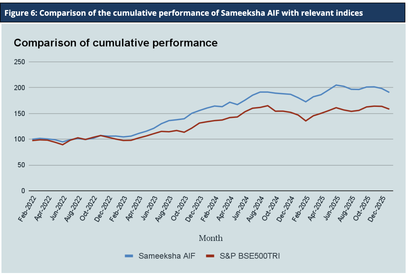 For FY26, Sameeksha AIF has underperformed the benchmark BSE 500 TRI by generating 4.6% returns against the benchmark BSE 500 TRI returns of 8.8%. Looking at our performance over the financial years (Table 12), we have outperformed our benchmark in FY 2023, FY 2024, and FY 2025.
