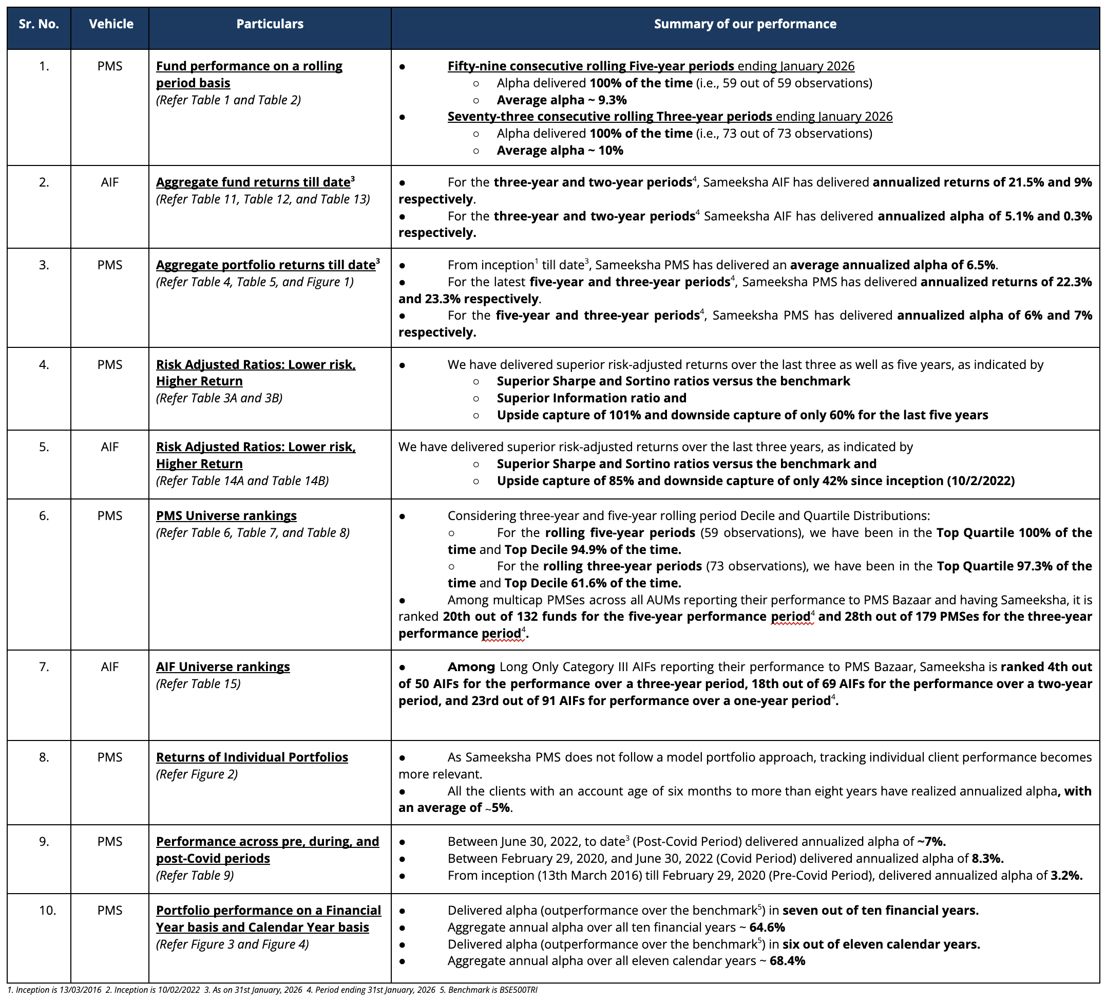 For the Calendar Year 2026, our performance was roughly 1.3% lower than the BSE 500 TRI benchmark, indicating underperformance. Looking at our performance over calendar years (Figure 4), we have outperformed the benchmark in six out of eleven calendar years, and the sum of outperformance of 88.4% in six years far exceeds the sum of underperformance of 20.1% in the remaining five years.