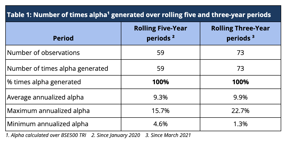 Rolling returns are a more useful indicator of consistency in performance versus single-period returns. For the rolling five-year periods applicable from March 2021 till date, Sameeksha PMS has delivered aggregate annualized alpha 100% of the time (59 out of 59 observations), ranging from ~5% to ~16%. For the rolling three-year periods applicable from January 2020 till date, Sameeksha PMS has delivered aggregate annualized alpha 100% of the time (73 out of 73 observations), ranging from ~1% to ~23% (Table 1). For both rolling five and three-year periods covered in Table 1, alpha has averaged around 9.3% and 10% respectively.