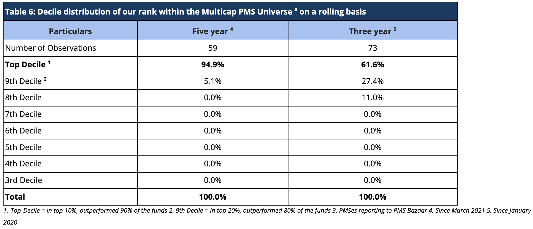 We present our rankings among the multicap PMSes across all AUM sizes. Within this universe, we are 20th out of 132 PMSes for the five year period and 28th out of 179 PMSes for three-year period, highlighting our superior performance over the long term periods (Table 8). Among the multicap universe across all AUM sizes, we are consistently ranked in the Top Decile for the five-year period for 56 out of 59 observations, reflecting well on the consistency of our performance.