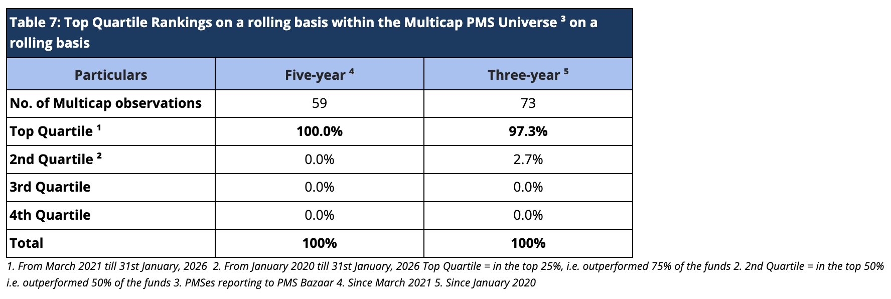 * Period ending 31st January, 2026, ** Three-year period for PMS and AIF, also five year period for PMS, *** Rolling five-year returns of all the Multicap PMSes reporting to PMS Bazaar, **** For rolling five year periods from inception till date, ***** Five-year Period