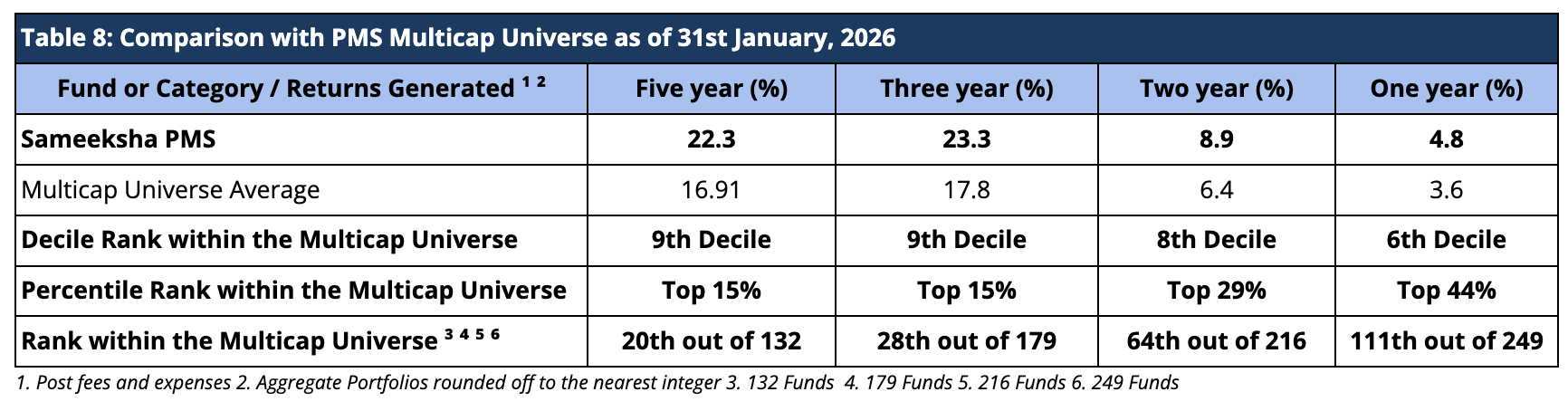 Because we don’t follow a model portfolio strategy, the performance of individual clients is far more important than overall portfolio aggregate returns (Figure 2). For investors who have been with us for five years or more, Sameeksha PMS has returned a very substantial alpha with an average annualized alpha of approx. 4.4% for the five years ending 31st January, 2026. Similarly, for investors who have been with us for three years or more, Sameeksha PMS has returned substantial alpha with an average annualized alpha of approx. 6% for the three years ending 31st January, 2026. The Figure below shows the average annualized returns and alpha over different periods of time of all the clients as on 31st January, 2026.