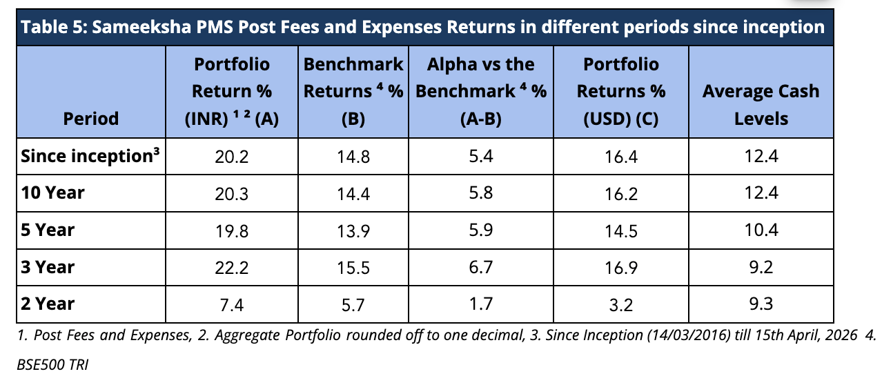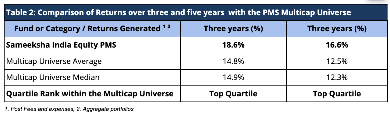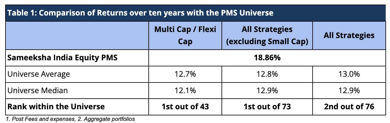 It is with immense gratitude and a deep sense of purpose that we write to you today to share a significant milestone. As of March 31st, 2026, Sameeksha Capital India Equity Fund PMS has completed ten years and has immediately grabbed the top spot among all multicap and flexi-cap PMS strategies reporting to PMS Bazaar (Table 1). We are also number one among all PMSes across all categories barring only a single fund operating in the small-cap space.