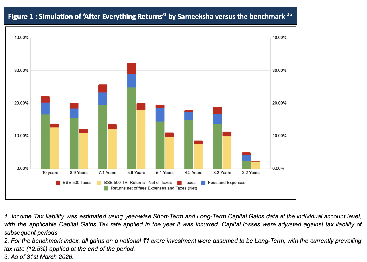 Actual after expenses fees and taxes returns earned by our Investors: Because each PMS account is different and we don’t follow a model portfolio approach, it is relevant and important for investors to know how they would have done depending on the tenure of the specific account. To answer this question, and to provide a fully transparent and realistic view of our performance, we conducted an exercise to compute post-tax returns by taking a sample of investors with tenure ranging from ten years to about two years (Figure 1). We started with gross portfolio returns before all fees, expenses and Income Taxes and subtracted them all. We believe that such an exercise especially for a duration of ten years or longer is rarely done for investors by any of the fund managers in mutual fund, PMS or AIF space. Furthermore, we have also provided the returns investors would have earned by investing in our benchmark BSE500 TRI. We note that no option has existed for such an extended period to invest in a fund that mirrors that of the stated benchmark. We further note that even the options that have emerged have reported returns a tad below the benchmark. We are happy to report that for a duration of three years or longer, we have delivered meaningful value (outperformance over benchmark) to our investors after accounting for everything including income taxes.