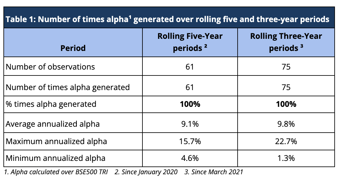Rolling returns are a more useful indicator of consistency in performance versus single-period returns. For the rolling five-year periods applicable from March 2021 till date, Sameeksha India Equity PMS has delivered aggregate annualized alpha 100% of the time (61 out of 61 observations), ranging from ~5% to ~16%. For the rolling three-year periods applicable from January 2020 till date, Sameeksha India Equity PMS has delivered aggregate annualized alpha 100% of the time (75 out of 75 observations), ranging from ~1% to ~23% (Table 1). For both rolling five and three-year periods covered in Table 1, alpha has averaged around 9.1% and 9.8% respectively.