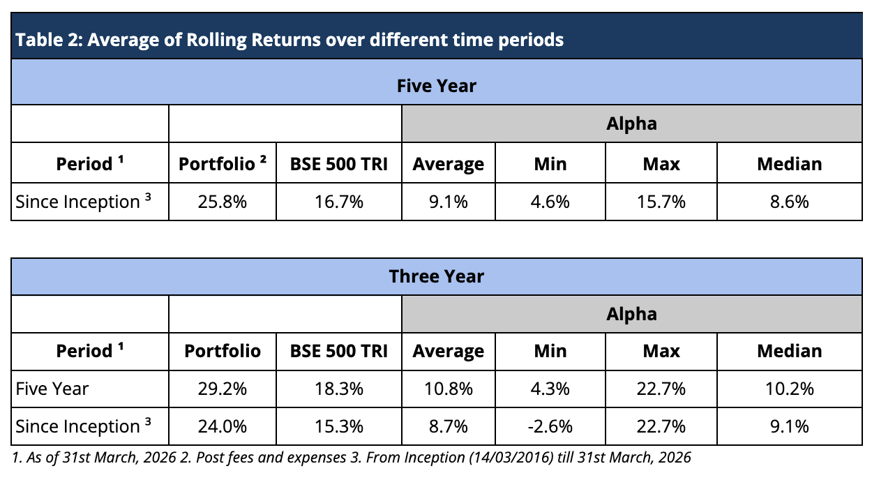 By averaging these rolling returns over different lookback periods, we gain a deeper understanding of how consistently the portfolio has delivered value over time, compared to the BSE 500 TRI benchmark (Table 2).