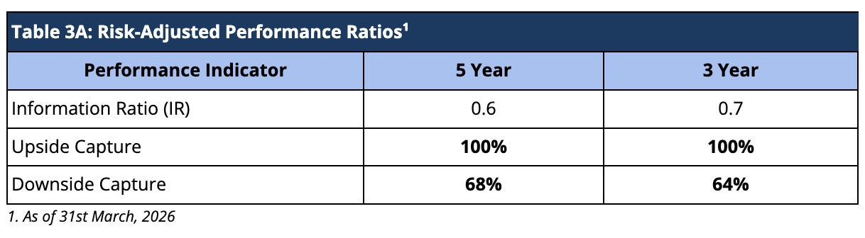 When compared on a risk-adjusted basis, our AIF has shown an even stronger performance. The Information Ratio (IR) measures the excess return of a portfolio over a benchmark per unit of active risk. A higher Information Ratio (IR) suggests better risk-adjusted performance.