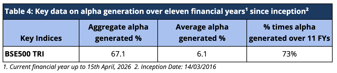 Sameeksha India Equity PMS has delivered a substantial aggregate annual alpha of 67.1% over BSE 500 TRI over the eleven financial years (including the current incomplete financial year), implying an average alpha of 6.1% since inception (Table 4).