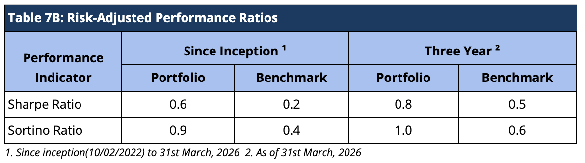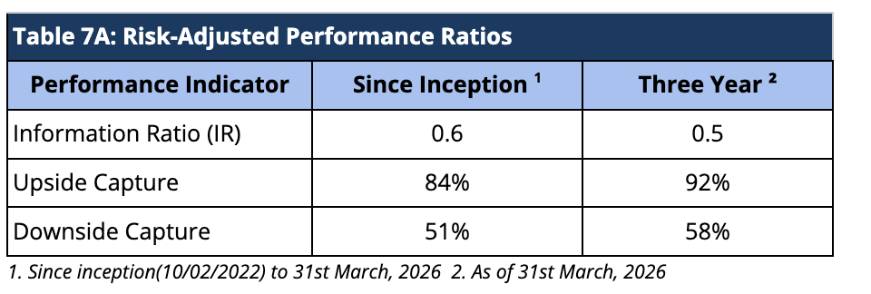 Moreover, Upside Capture measures how well a fund performs as compared to a benchmark when the benchmark has positive returns. A higher upside capture ratio (> 100%) indicates that the fund captures more of the benchmark’s positive movements. Whereas, Downside Capture measures how well a fund performs compared to a benchmark when the benchmark has negative returns. A lower downside capture ratio (< 100%) indicates that the fund preserves capital better during market downturns (Table 7A).