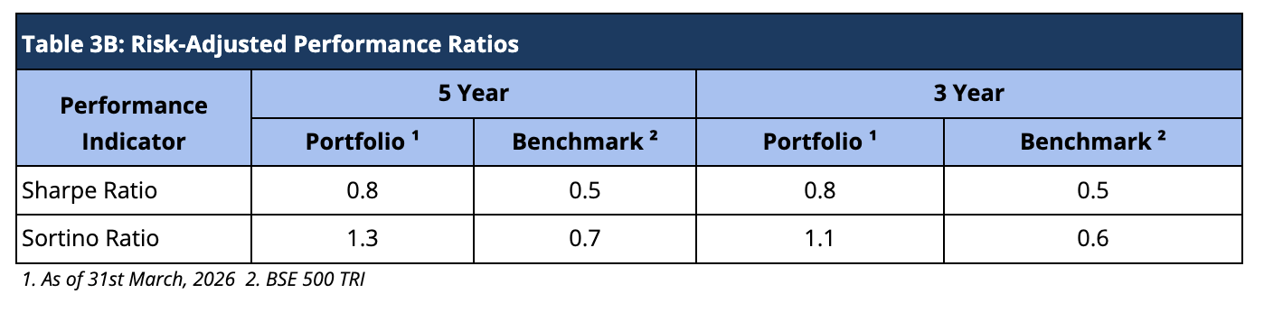When compared on a risk-adjusted basis, our PMS has shown an even stronger performance. The Information Ratio (IR) measures the excess return of a portfolio over a benchmark per unit of active risk. A higher Information Ratio suggests better risk-adjusted performance.